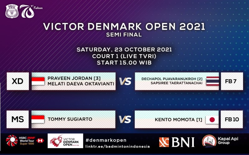 Tempias.com, JAKARTA – TVRI akan kembali menayangkan live pertandingan semi final Denmark Open 2021 hari ini, Sabtu 23 Oktober 2021 mulai pukul 15.00 WIB.