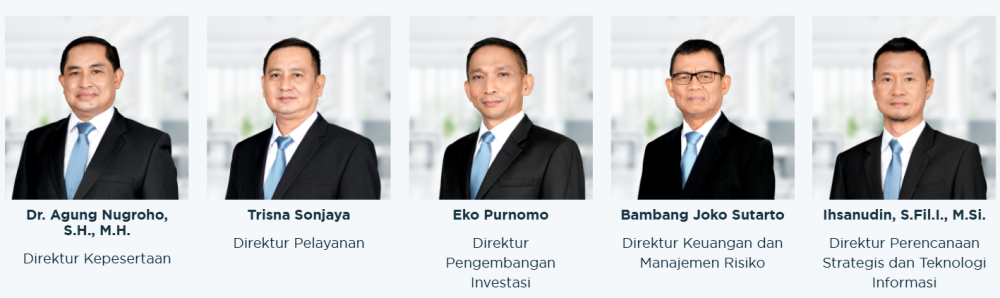 Posisi Direktur Perencanaan BPJS Ketenagakerjaan dijabat oleh Trisna Sonjaya, Direktur Pengembangan Investasi BPJS Ketenagakerjaan oleh Eko Purnomo, Direktur Keuangan dan Manajemen Risiko oleh Bambang Joko Sutarto, Direktur Perencanaan Strategis dan Teknologi Informasi dijabat oleh Ihsanudin, dan Direktur Human Capital & Umum BPJS Ketanagkerjaan dijabat Harjono Siswanto.